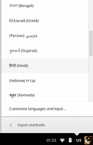 前往 [設定] → [顯示進階設定] → [語言]。按一下 [語言和輸入設定] 按鈕,然後選取需要的輸入工具。請注意,標示為「語言名稱以該國文字顯示」(Chrome 用戶介面的語言名稱) 的輸入工具,例如「हिन्दी」(北印度文) 屬於音譯輸入工具。音譯工具可將您輸入的拼音轉換成目標語言。