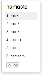 音譯工具支援模糊拼音對應。您只要以拉丁字母輸入最相近的發音,音譯工具就會建議最有可能符合您要求的字詞。例如,無論您輸入「namaste」或「nemaste」,系統都會提議「नमस्ते」為候選字詞。